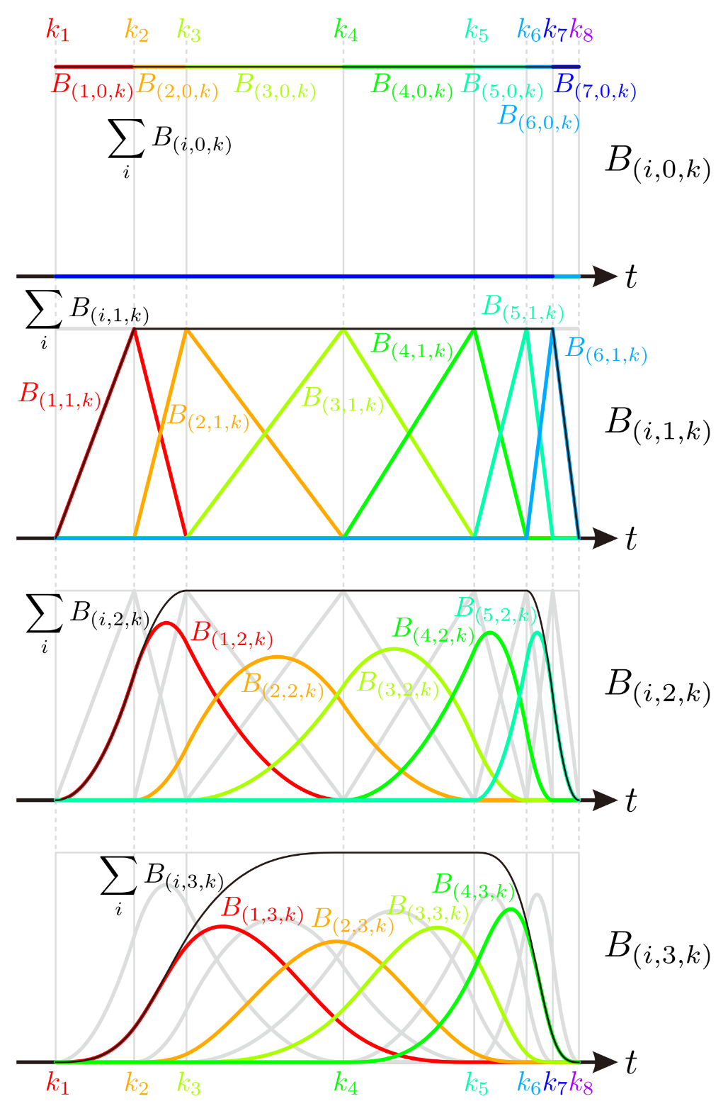 \[\begin{aligned} {B}_{(i,p,k)}(t) &= \frac{t-k_{i}}{k_{i+p}-k_{i}}{B}_{(i,p-1,k)}(t) +\frac{k_{i+p+1}-t}{k_{i+p+1}-k_{i+1}}{B}_{(i+1,p-1,k)}(t) \\ {B}_{(i,0,k)}(t) &= \begin{cases} &1\quad (k_{i}\le t< k_{i+1})\\ &0\quad (\text{otherwise}) \end{cases} \end{aligned}\]