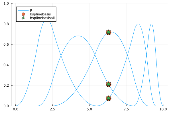 scatter!(fill(t,3), [bsplinebasis(P,2,t), bsplinebasis(P,3,t), bsplinebasis(P,4,t)]; markershape=:circle, markersize=10, label="bsplinebasis")