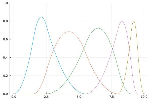 plot([t->bsplinebasis₊₀(P,i,t) for i in 1:dim(P)], 0, 10, ylims=(0,1), label=false)