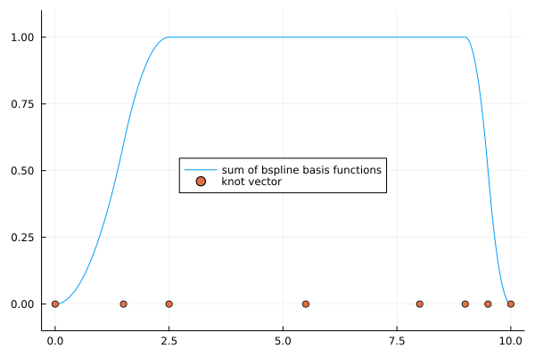 plot(t->sum(bsplinebasis(P,i,t) for i in 1:dim(P)), 0, 10, ylims=(-0.1, 1.1), label="sum of bspline basis functions")