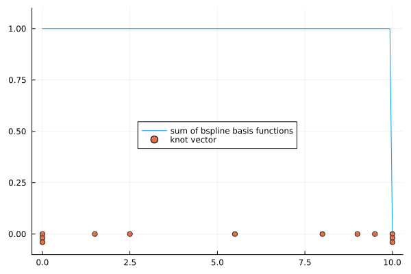 plot(t->sum(bsplinebasis₊₀(P,i,t) for i in 1:dim(P)), 0, 10, ylims=(-0.1, 1.1), label="sum of bspline basis functions")
