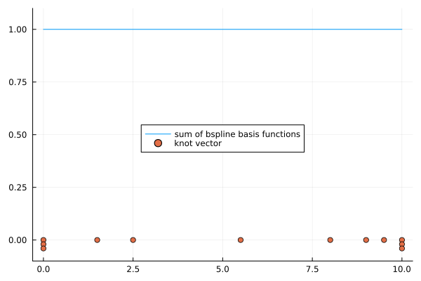 plot!(t->sum(bsplinebasis(P,i,t) for i in 1:dim(P)),0,10, label="Sum of B-spline basis")