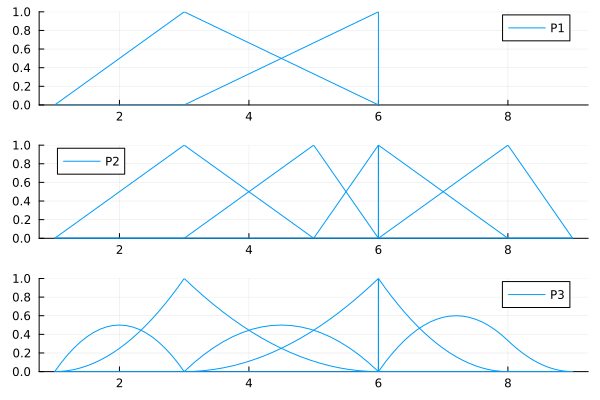 Here are plots of the B-spline basis functions of the spaces P1, P2, P3.