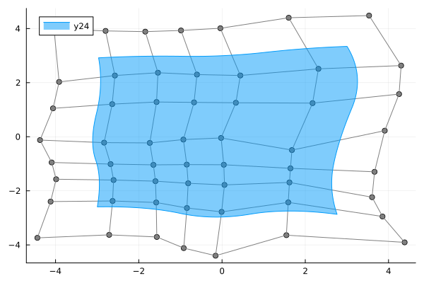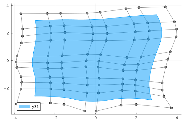 julia> k₊ = (KnotVector([3.3,4.2]), KnotVector([3.8,3.2,5.3])) # additional knot vectors(KnotVector([3.3, 4.2]), KnotVector([3.2, 3.8, 5.3]))julia> M_h = refinement(M, k₊) # refinement of B-spline manifoldBSplineManifold{2, (2, 2), StaticArraysCore.SVector{2, Float64}, Float64, Tuple{BSplineSpace{2, Float64, KnotVector{Float64}}, BSplineSpace{2, Float64, KnotVector{Float64}}}}(StaticArraysCore.SVector{2, Float64}[[-4.436481525222188, -3.7392559679567654] [-4.118268299116978, -2.3974117050021446] … [-3.9140778173271045, 2.02747657297094] [-4.037719953640843, 3.989570689798291]; [-2.71176928574438, -3.6287319046417164] [-2.6290028888369674, -2.3754195103813136] … [-2.5737646016809177, 2.2630448636082017] [-2.798066419130518, 3.913009777996155]; … ; [1.5459602679993494, -3.640027067554792] [1.590734112983347, -2.426832143716899] … [2.3162362491479245, 2.510716406024899] [1.6019837034157864, 4.399759245537201]; [4.387041414974148, -3.906158146682025] [3.855379387558674, -2.949536744482456] … [4.3026314483063555, 2.6310250793110312] [3.5324898804805147, 4.480663191353303]], (BSplineSpace{2, Float64, KnotVector{Float64}}(KnotVector([1.0, 2.0, 3.0, 3.3, 4.0, 4.2, 5.0, 6.0, 7.0, 8.0])), BSplineSpace{2, Float64, KnotVector{Float64}}(KnotVector([1.0, 2.0, 3.0, 3.2, 3.8, 4.0, 5.0, 5.3, 6.0, 7.0, 8.0]))))julia> plot(M_h)Plot{Plots.GRBackend() n=24}